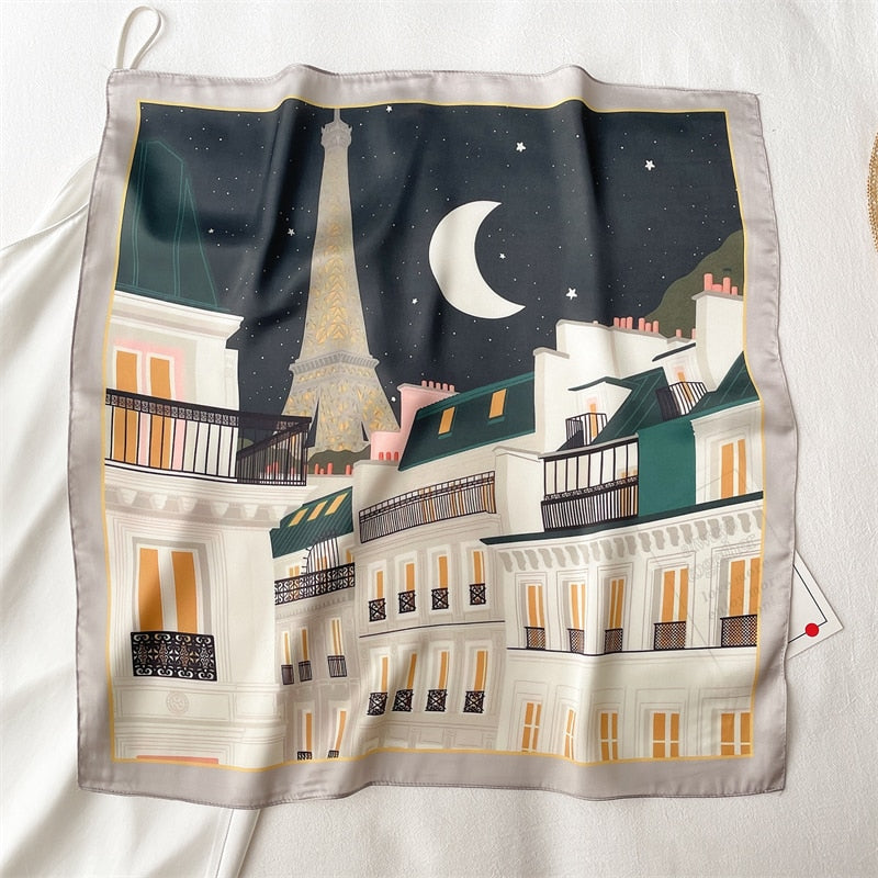 Agrémentez votre coiffure avec ce foulard pour cheveux de dimensions 50 x 50 cm, inspiré par les nuances mystiques de minuit à Paris. Ses motifs délicats et intemporels reflètent la beauté chic et moderne de la capitale française.